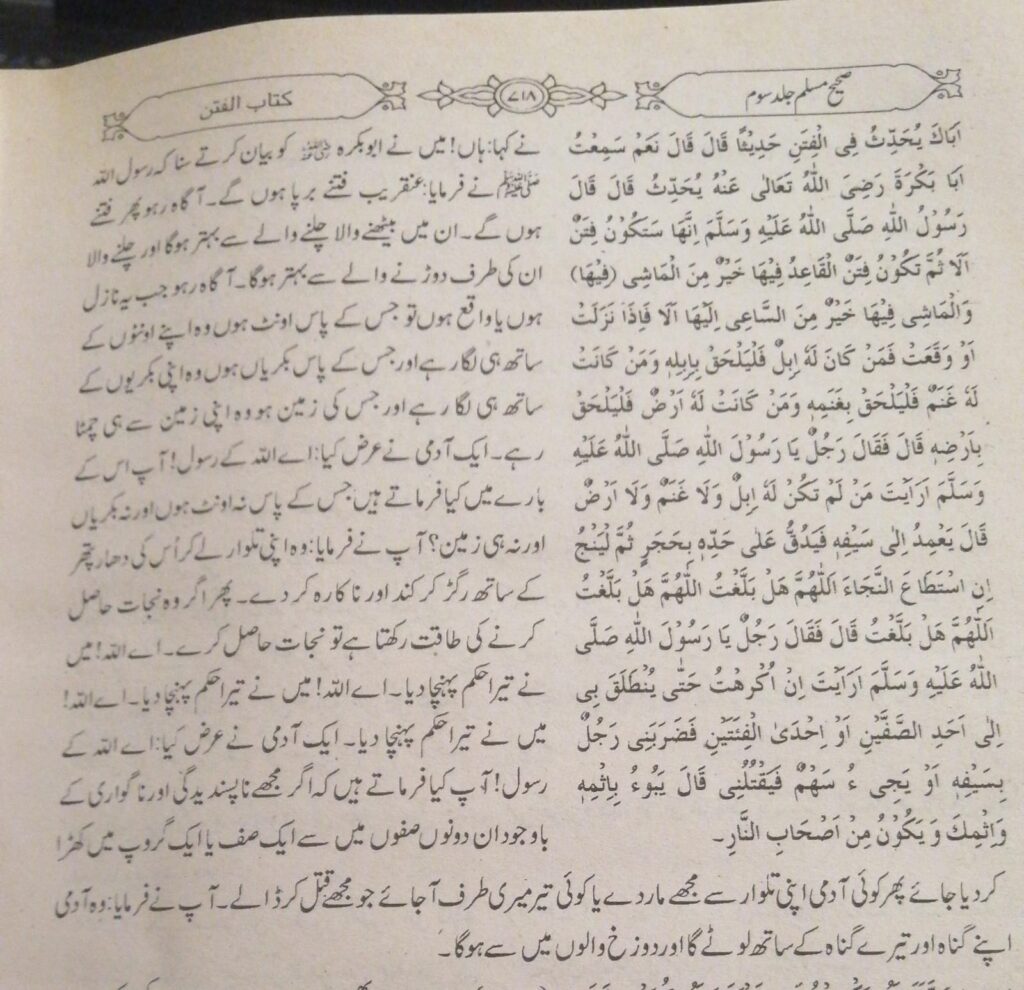 سر، اس معاملے میں کچھ رہنمائی چاہیے۔ میں صحیح مسلم کی کتاب الفتن میں ایک حدیث پڑھ رہا تھا، جس میں رسول اللہ صلی اللہ علیہ وسلم نے فرمایا کہ عنقریب فتنے برپا ہوں گے۔ ان فتنوں میں بیٹھا ہوا کھڑے ہونے والے سے بہتر ہوگا، کھڑا ہوا چلنے والے سے بہتر ہوگا، اور چلنے والا دوڑنے والے سے بہتر ہوگا۔ساتھ یہ بھی ذکر ہے کہ ایک شخص نے پوچھا: اے اللہ کے رسول، جس کے پاس نہ اونٹ ہوں، نہ بکریاں ہوں، اور نہ زمین ہو، وہ کیا کرے؟ تو آپ صلی اللہ علیہ وسلم نے فرمایا کہ وہ اپنی تلوار لے کر اس کی دھار کو پتھر سے ماند کر دے، پھر اگر وہ نجات حاصل کرنے کی طاقت رکھتا ہو تو نجات حاصل کر لے۔